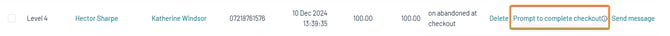 The Prompt to complete checkout action is found within the Actions column. You can also choose to Delete their data or send a message from here.
