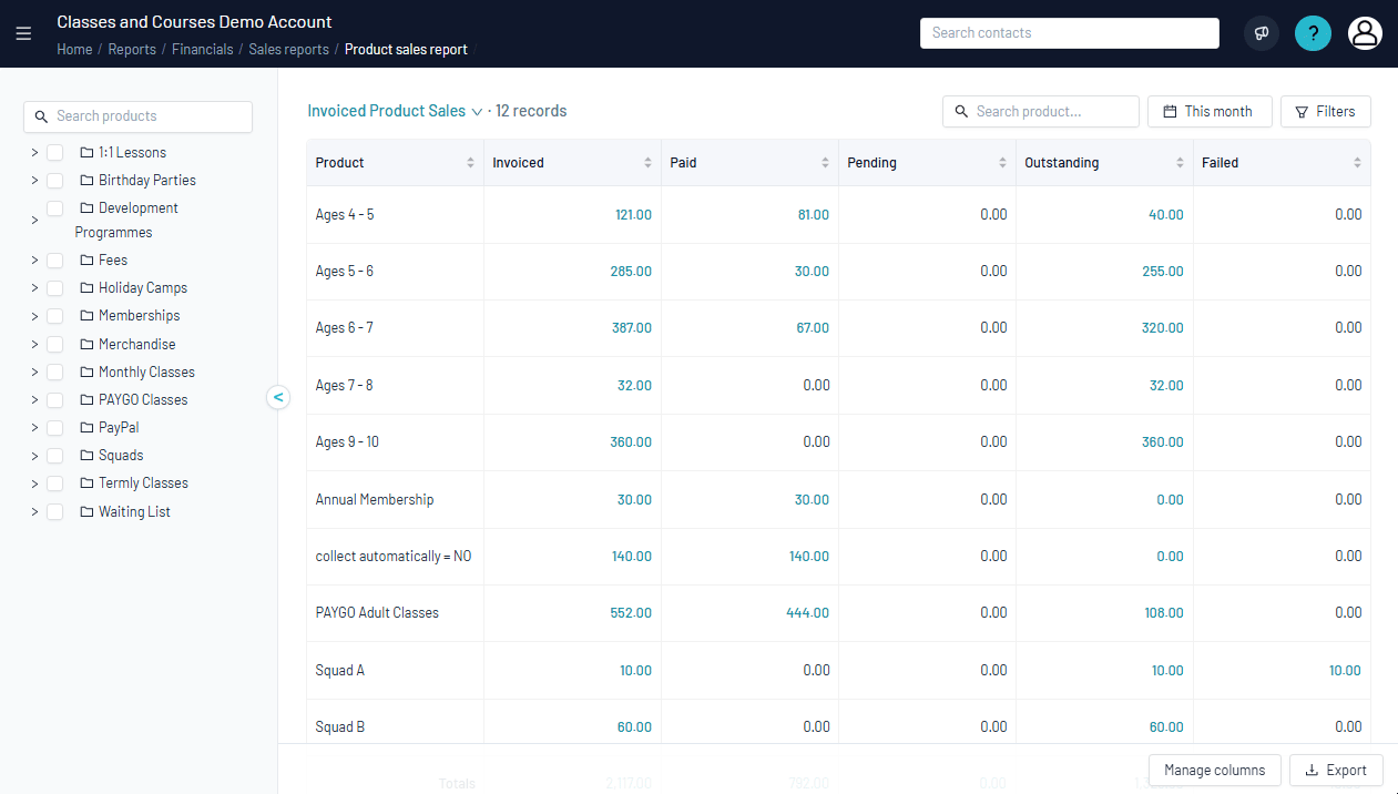 This report gives you a clear view of all of your invoices and their status, with multiple actions available such as raising a credit, manually collecting the payment or cancelling the invoice entirely.
