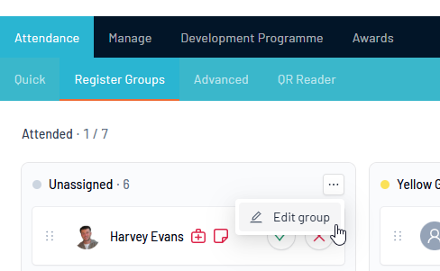 You can also add/remove attendees and manage groups by clicking the Edit Group menu (three dots) in the top-right corner of the group container. This view gives a variety of ways you can manage your attendees and move them between the groups.