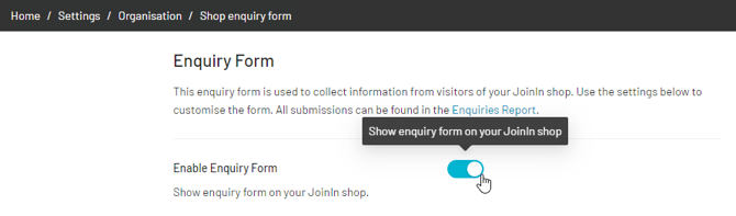 To setup and enable your shop enquiry form, go to Home > Settings > Organisation > Shop Enquiry Form.