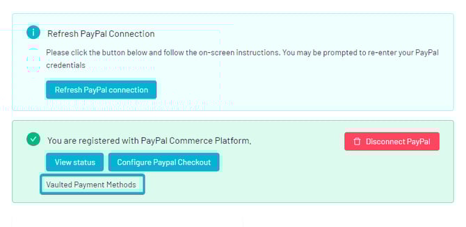 - After completing the required steps, you can return and refresh your page. You will then see the screen has changed to show โVaulted Payment Methodsโ in the green box: