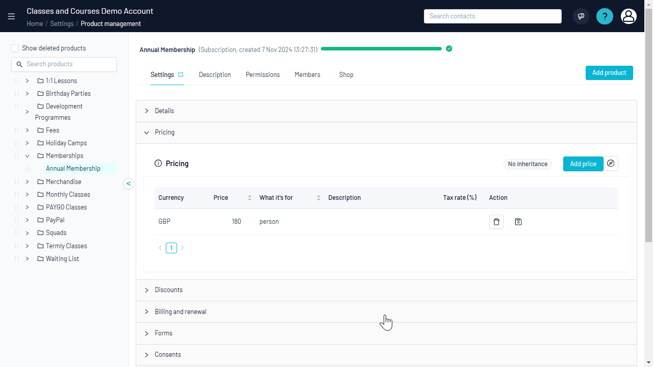 In the demonstration below, you can see that there has been a price of £180 set at the product level - if this price is deleted, the product automatically 'inherits' the price that was set at the top product group level (£200):